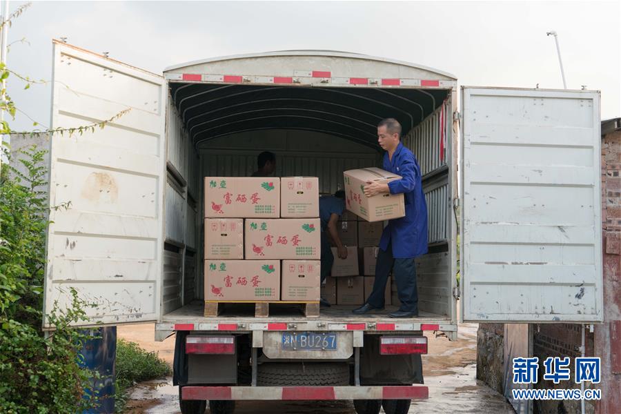 8月9日,新田县枧头镇下富村致富带头人肖石军将包装好的鸡蛋装上货车,运往附近县城的销售点。 新华社发(万志云 摄)