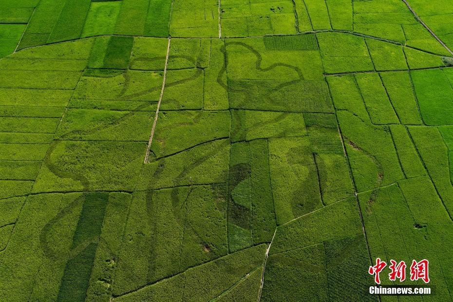 8月10日,俯瞰位于贵州省兴义市万峰林景区的“福”字稻田景观。贵州省兴义市万峰林景区“福”字稻田景观采用常规水稻做边界,紫叶水稻构图的定植模式,根据田块大小和视觉效果确定图案斑块作业面积,在水稻生长的苗期、花期,通过水稻叶色、花色的自然变化展现特殊色彩效果。 中新社记者 贺俊怡 摄