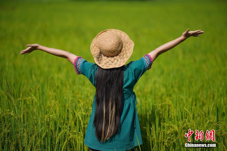贵州省兴义市万峰林景区“福”字稻田景观采用常规水稻做边界,紫叶水稻构图的定植模式,根据田块大小和视觉效果确定图案斑块作业面积,在水稻生长的苗期、花期,通过水稻叶色、花色的自然变化展现特殊色彩效果。图为一名游客在“福”字稻田里游玩。 中新社记者 贺俊怡 摄