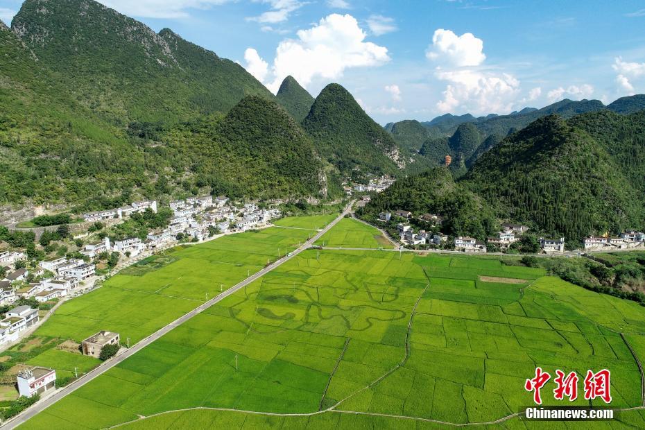 8月10日,俯瞰位于贵州省兴义市万峰林景区的“福”字稻田景观。贵州省兴义市万峰林景区“福”字稻田景观采用常规水稻做边界,紫叶水稻构图的定植模式,根据田块大小和视觉效果确定图案斑块作业面积,在水稻生长的苗期、花期,通过水稻叶色、花色的自然变化展现特殊色彩效果。 中新社记者 贺俊怡 摄