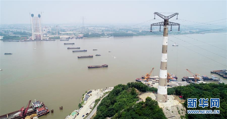 江苏对镇江220千伏五峰山跨江线路启动升高改造工程,进行旧线拆除施工。这是在长江镇江段靠近五峰山跨江线路的一处江面,六艘驳船准备承接下落的旧导线(6月14日无人机拍摄)。