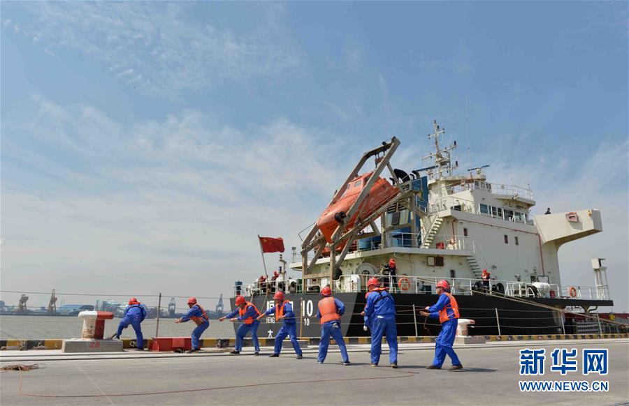 在长江岸线南通段一处港口码头,一艘货轮锚定后,工作人员合力牵引岸电连接电缆(6月2日摄)。