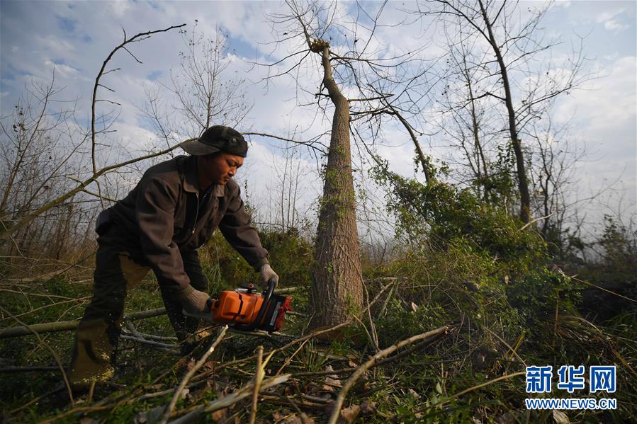 在位于湖南沅江市的南洞庭湖自然保护区核心区内,工作人员在清理欧美黑杨(2017年11月27日摄)。