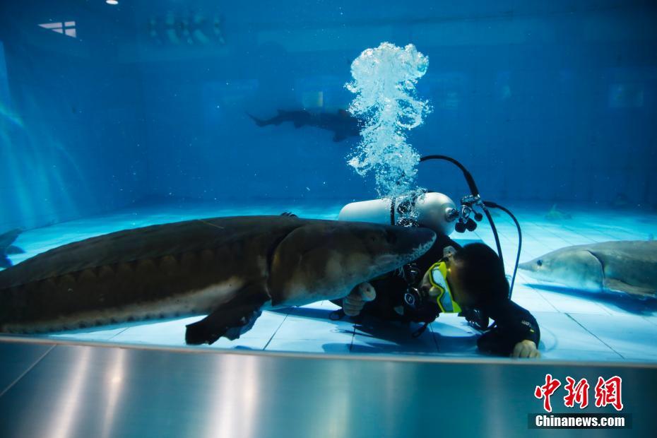 8月12日,饲养员在给中华鲟喂食。当日,“大江奔流—来自长江经济带的报道”记者团来到位于崇明的上海市长江口中华鲟自然保护区,探访上海长江口“中华鲟之家”。 中新社记者 汤彦俊 摄