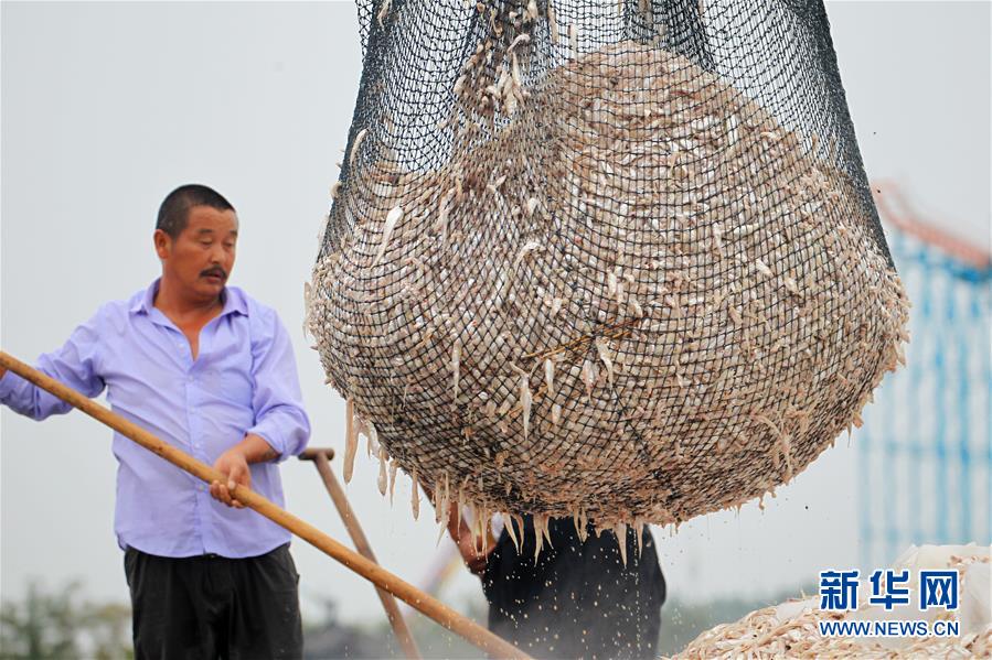 8月12日,江苏省淮安市洪泽区渔民装运毛刀鱼。 目前正值江苏省洪泽湖水域毛刀鱼捕捞期,洪泽湖毛刀鱼大量上市,渔民抓紧捕捞、晾晒,供应各地市场。 新华社发(王开成 摄)