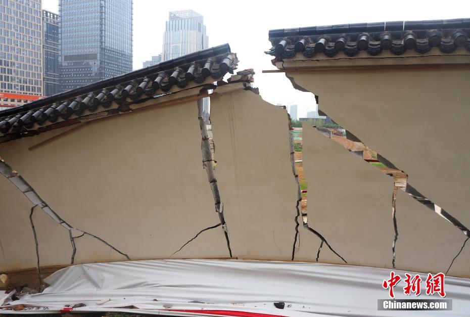 因地面下陷,旁边工地的施工围墙也出现开裂。 刘占昆 摄