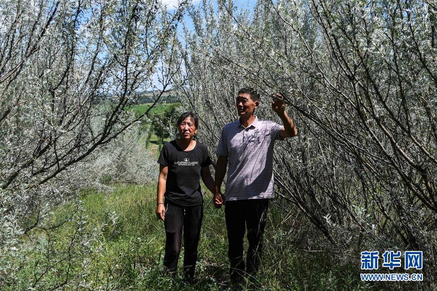 马云平和妻子王长荣查看柠条林(8月10日摄)。