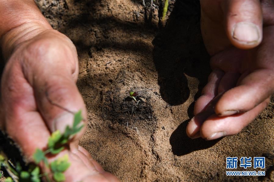 一颗种子在马云平治理后的沙地中发芽(8月10日摄)。