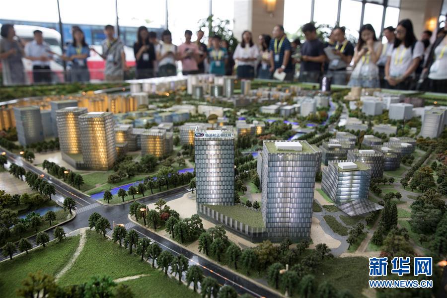 8月13日,在上海临港松江科技城沙盘前,参观者听取建设规划。 新华社记者 金立旺 摄