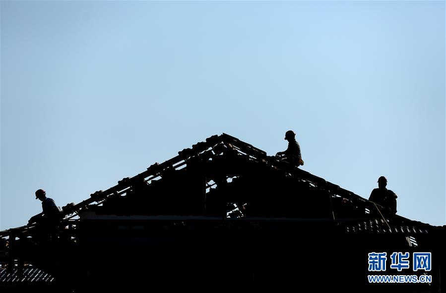 8月13日,在贵州省黔东南苗族侗族自治州丹寨县兴仁镇摆泥村,建筑工人在烈日下施工。