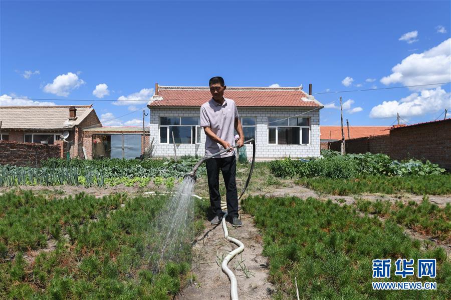 马云平在家中给育苗地浇水(8月10日摄)。新华社记者刘磊 摄