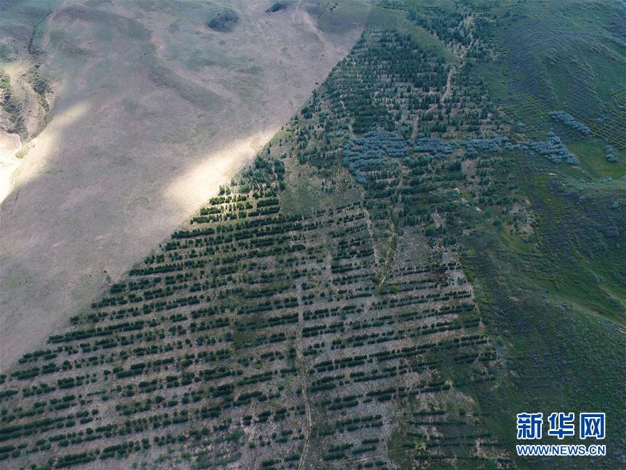 马云平夫妻治理的绿地与旁边的土地形成鲜明对比(8月10日无人机拍摄)。新华社记者刘磊 摄