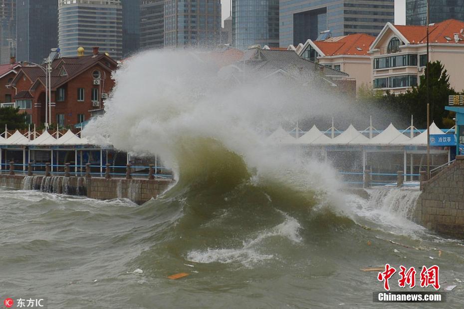 2018年8月14日,受台风“摩羯”低压环流持续影响,山东青岛五四广场掀起风暴潮,十几米高巨浪吸引了不少游客驻足观看。 图片来源:东方IC 版权作品 请勿转载