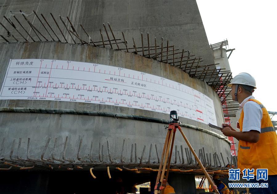 8月14日,中铁上海工程局集团的工作人员在转体施工现场测量转体角度。 新华社记者 李安摄