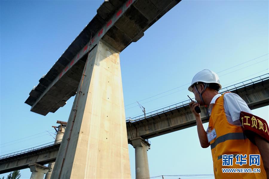 8月14日,中铁上海工程局集团的工作人员在转体施工现场指挥作业。 新华社记者 李安摄