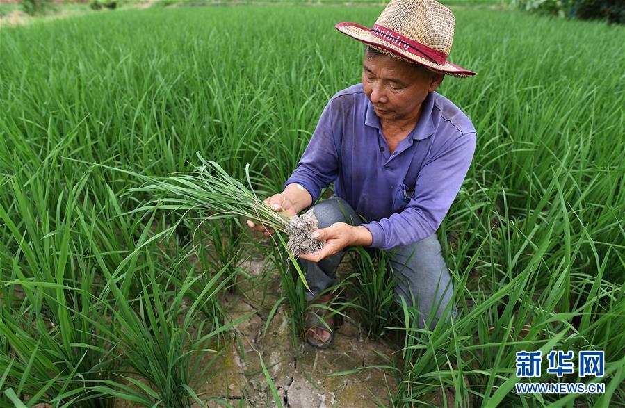 8月14日,在江西省金溪县琉璃乡印山村,村民在稻田里查看受旱的水稻。受连日高温少雨天气影响,江西省江河湖泊持续低水位,水库蓄水不足,部分地区旱情持续。新华社记者 万象 摄