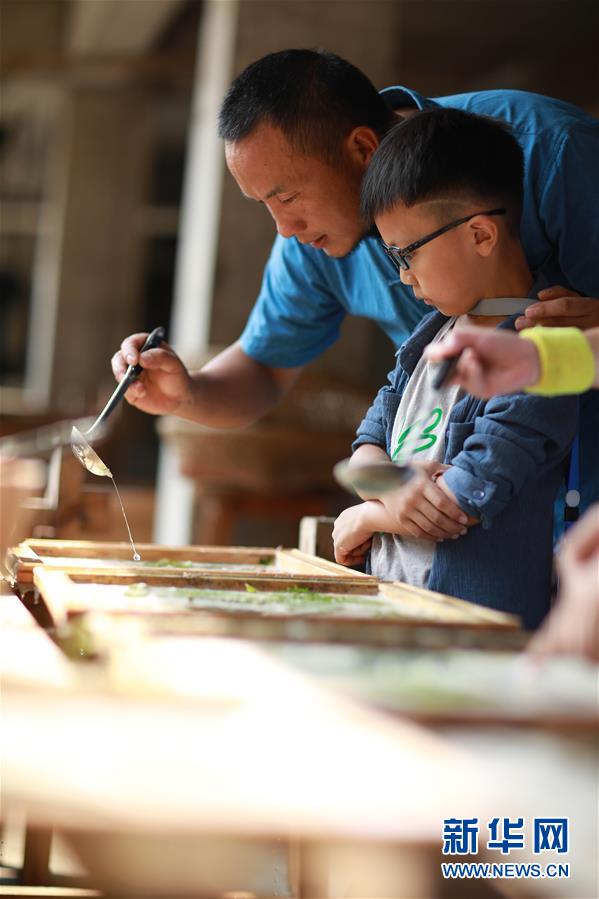 8月14日,在贵州省黔东南苗族侗族自治州丹寨县南皋乡石桥村“纸会唱歌”古法造纸研学基地,潘玉华在指导小朋友“浇纸”。新华社发(黄晓海 摄)