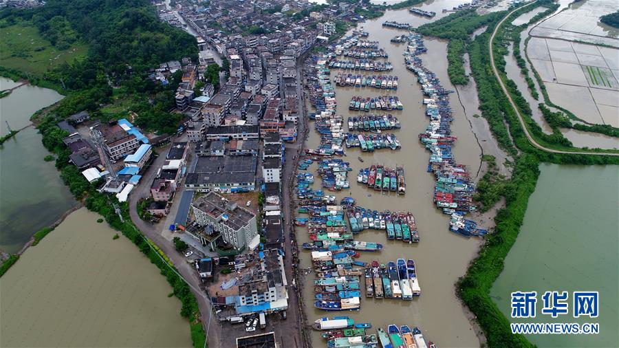 这是在广东江门市横山渔港避风的渔船(8月14日无人机拍摄)。 新华社记者张加扬摄