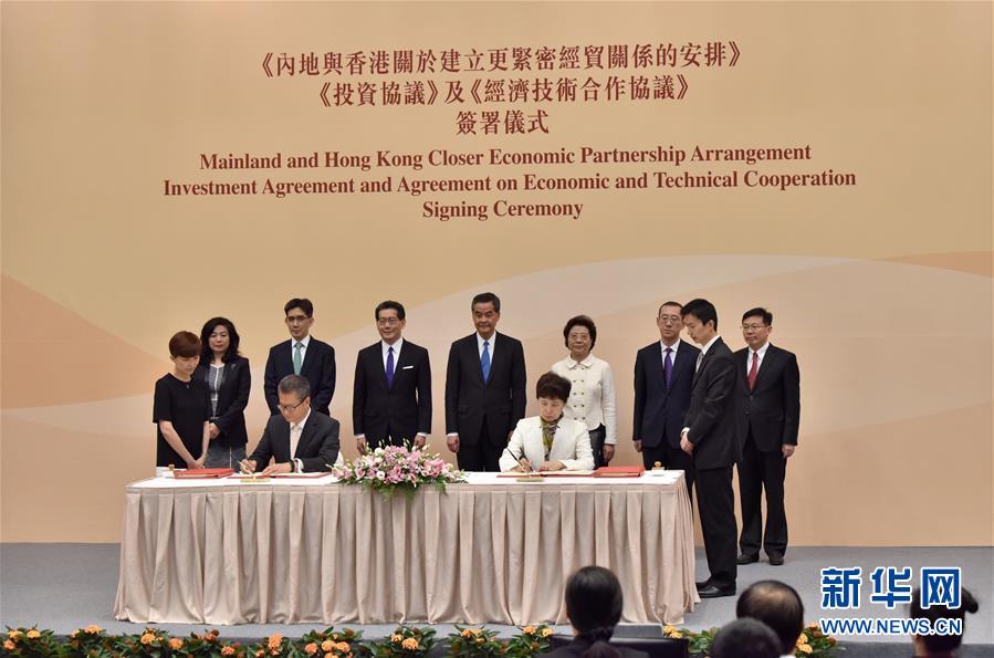 2017年6月28日在香港特区政府总部拍摄的《内地与香港关于建立更紧密经贸关系的安排》(CEPA)下的《投资协议》和《经济技术合作协议》签约仪式现场。 新华社发(王玺摄)