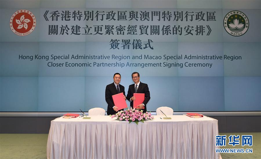 香港特区政府财政司司长陈茂波(右)和澳门特区政府经济财政司司长梁维特在香港签署《香港特别行政区与澳门特别行政区关于建立更紧密经贸关系的安排》(2017年10月27日摄)。新华社记者吕小炜摄