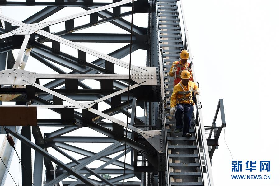8月14日,“护桥卫士”在被太阳炙烤得滚烫的钢梁上作业。新华社记者 唐奕 摄