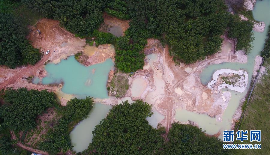 在万宁市兴隆华侨农场一处橡胶林内,采砂留下的深坑和堆砂点蚕食林地(7月30日无人机拍摄)。