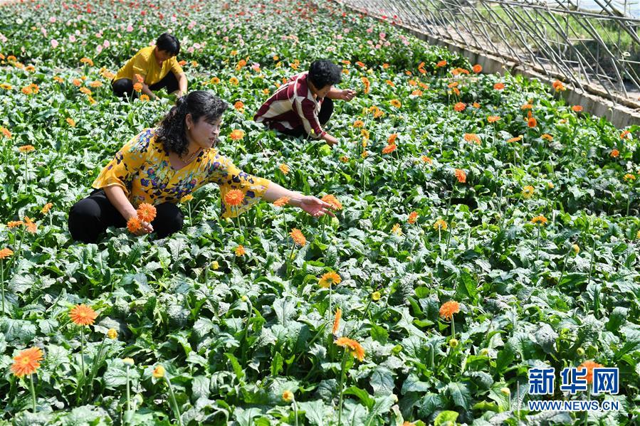 8月16日,河北省滦南县姚王庄镇李营村农民在大棚内管理种植的非洲菊。近年来,河北省滦南县在推进农业供给侧结构性改革的进程中,立足资源优势,以“一村一品”种植模式调整农业产业结构、培育农业特色主导产业,为乡村振兴注入活力。目前,滦南县特色种植面积达3万余亩,形成特色种植专业村100余个,带动万余名农民实现增收。新华社记者 牟宇 摄