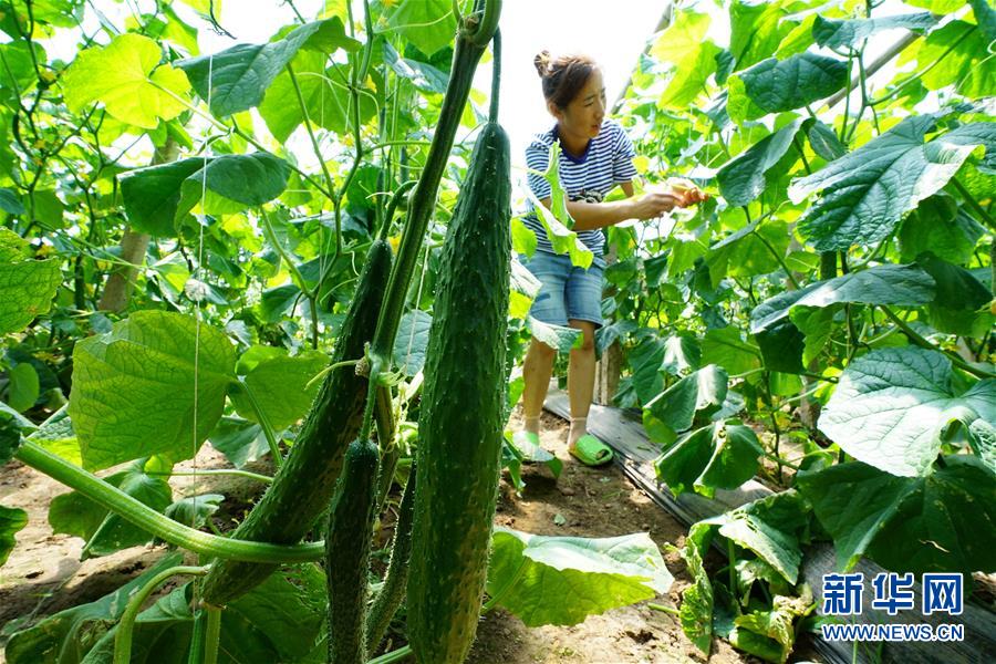 8月16日,河北省滦南县胡各庄镇刘营村农民在大棚内查看黄瓜长势。近年来,河北省滦南县在推进农业供给侧结构性改革的进程中,立足资源优势,以“一村一品”种植模式调整农业产业结构、培育农业特色主导产业,为乡村振兴注入活力。目前,滦南县特色种植面积达3万余亩,形成特色种植专业村100余个,带动万余名农民实现增收。新华社记者 牟宇 摄
