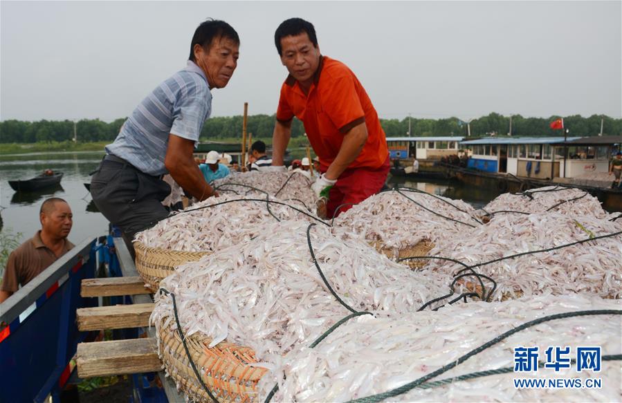 8月16日,渔民在巢湖市中垾镇巢湖岸边卸载水产品。 新华社发(苏自山 摄)