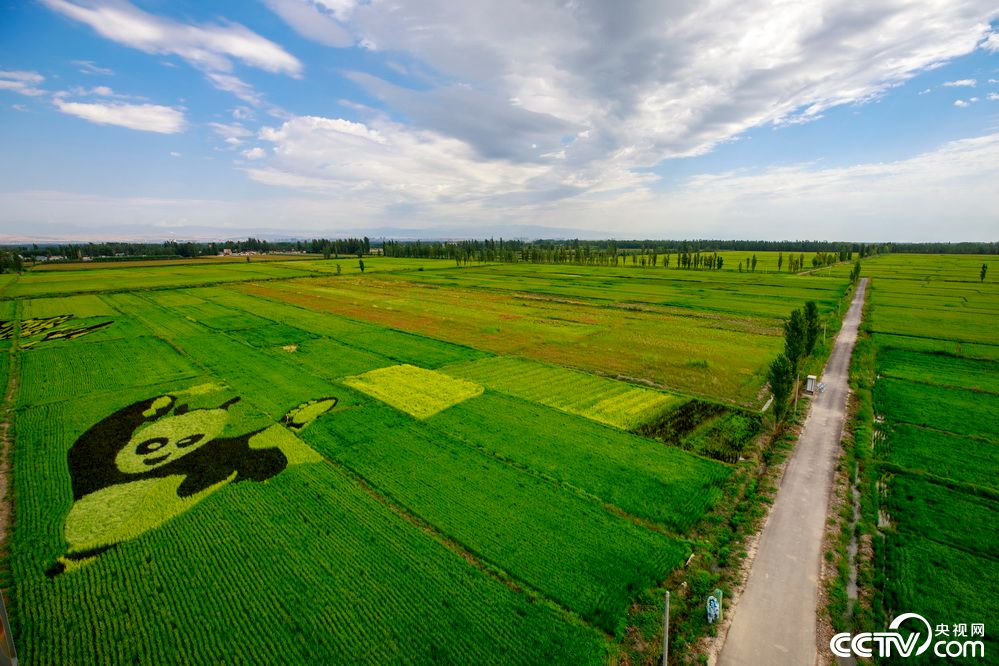 这片稻田画产业示范基地名为“绿梦飞扬”,始建于2015年,由观光塔和稻田画两部分组成,游客通过观光塔可在不同角度、不同高度俯瞰稻田画全景。稻田画总面积超过120亩,主要由“功夫熊猫”“战狼”“纳达齐乡”“我爱北京天安门”等多幅画组成。