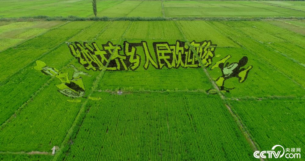 这片稻田画产业示范基地名为“绿梦飞扬”,始建于2015年,由观光塔和稻田画两部分组成,游客通过观光塔可在不同角度、不同高度俯瞰稻田画全景。稻田画总面积超过120亩,主要由“功夫熊猫”“战狼”“纳达齐乡”“我爱北京天安门”等多幅画组成。