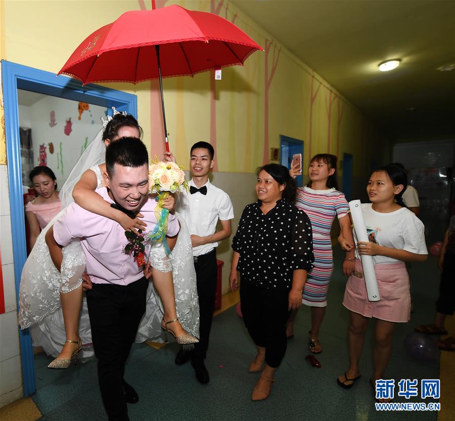 8月17日,新郎柳卫朋背着新娘柳芳芳走出房间。新华社发(黎寒池 摄)