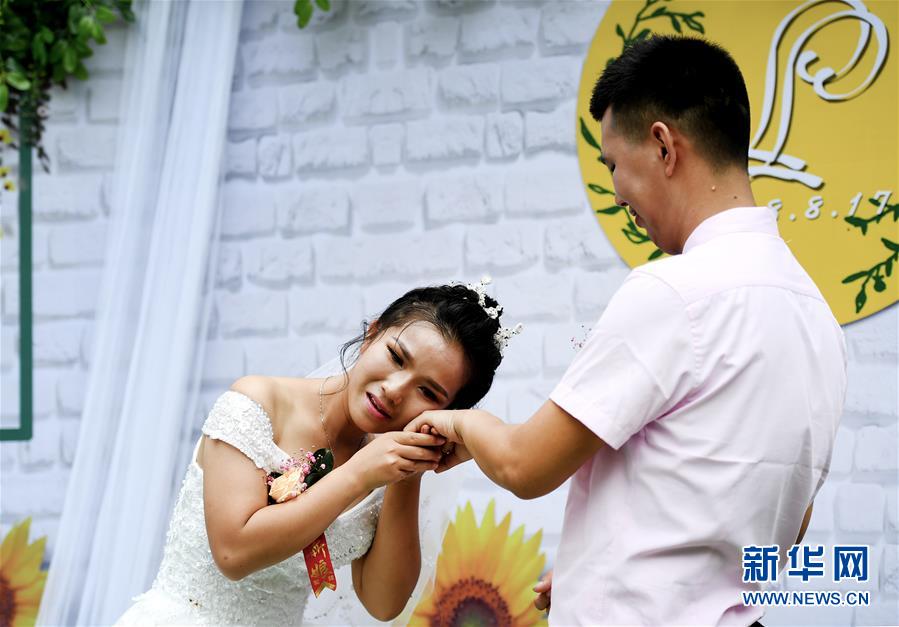8月17日,在柳州市儿童福利院婚礼现场,新娘柳芳芳(左)用脸颊贴近新郎手上的婚戒。新华社发(黎寒池 摄)