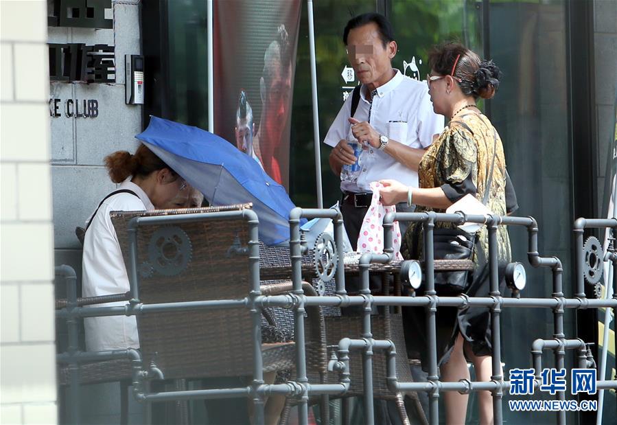 8月18日,诈骗嫌疑人杜某(左)利用雨伞掩护和被害老人鲁某进行交易,其余两名嫌疑人在旁望风。新华社记者 凡军 摄
