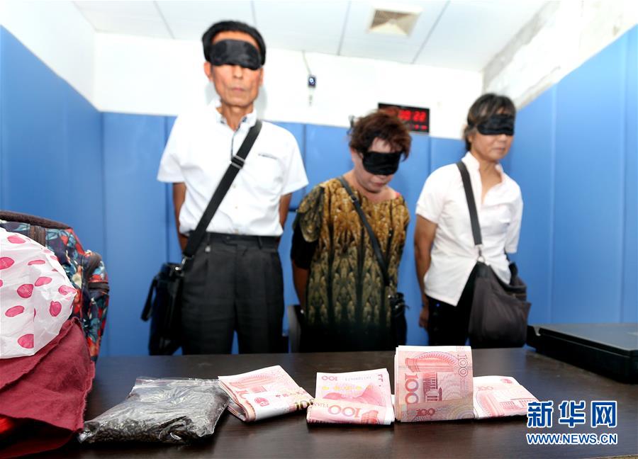 三名嫌疑人用一包价格低廉的决明子(下左)冒充神药诈骗老人鲁某4千元现金(8月18日摄)。新华社记者 凡军 摄