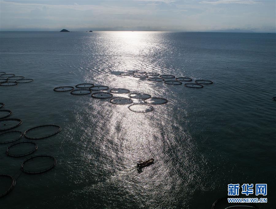 8月18日,渔船行驶在南麂岛马祖岙海域内的“海上牧场”大黄鱼养殖区(无人机拍摄)。 进入8月,浙江省温州市平阳县南麂镇海域上大片的大黄鱼、贻贝等特色海产品养殖区域迎来丰收季节,养殖户们驾驶渔船在养殖区海域进行打捞收获,在碧海蓝天下构成了一幅“海上牧场”的美丽丰收景象。 近年来,南麂镇政府引导渔民养殖户充分发挥“靠海吃海”的资源优势,大力发展海洋养殖经济和海岛旅游经济,实现了南麂由“生态美”向“产业美”,“产业美”向“经济美”的转变。同时该镇坚持以大黄鱼、贻贝等为特色产业支撑,精准发展高效海洋养殖业,重点培养一批新型职业渔民,依靠专业技术支持,实现深海仿生养殖,让好生态造就好品质,重点打造南麂养殖品牌,组建营销网络,拓展特色海产品市场。 新华社记者 徐昱摄