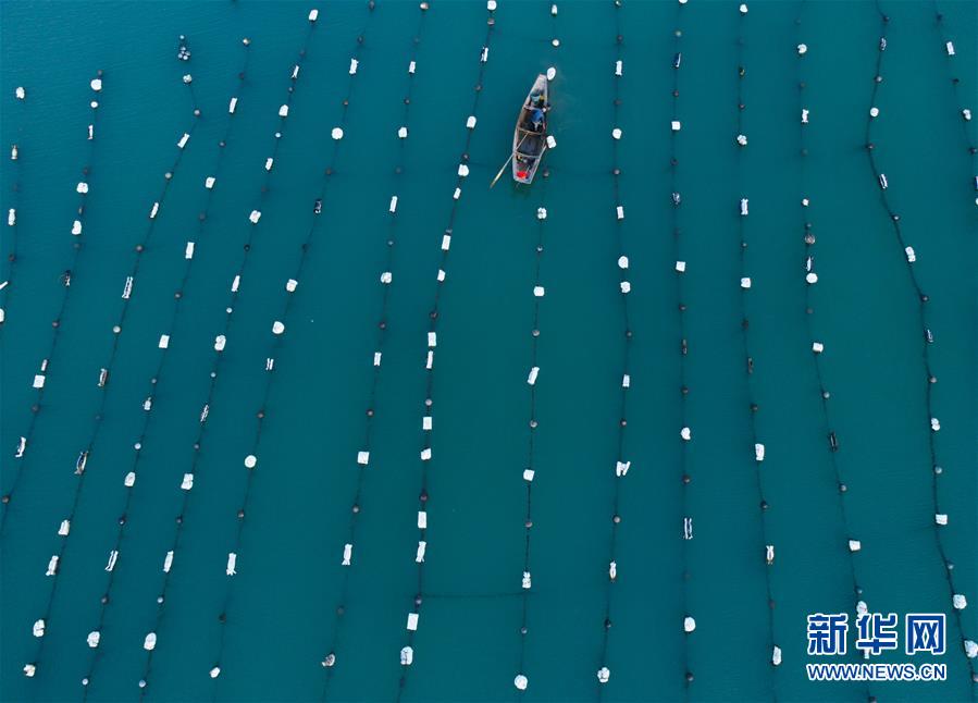 8月18日,南麂岛海域的“海上牧场”养殖区内,渔民准备进行养殖作业(无人机拍摄)。 进入8月,浙江省温州市平阳县南麂镇海域上大片的大黄鱼、贻贝等特色海产品养殖区域迎来丰收季节,养殖户们驾驶渔船在养殖区海域进行打捞收获,在碧海蓝天下构成了一幅“海上牧场”的美丽丰收景象。 近年来,南麂镇政府引导渔民养殖户充分发挥“靠海吃海”的资源优势,大力发展海洋养殖经济和海岛旅游经济,实现了南麂由“生态美”向“产业美”,“产业美”向“经济美”的转变。同时该镇坚持以大黄鱼、贻贝等为特色产业支撑,精准发展高效海洋养殖业,重点培养一批新型职业渔民,依靠专业技术支持,实现深海仿生养殖,让好生态造就好品质,重点打造南麂养殖品牌,组建营销网络,拓展特色海产品市场。 新华社记者 徐昱摄