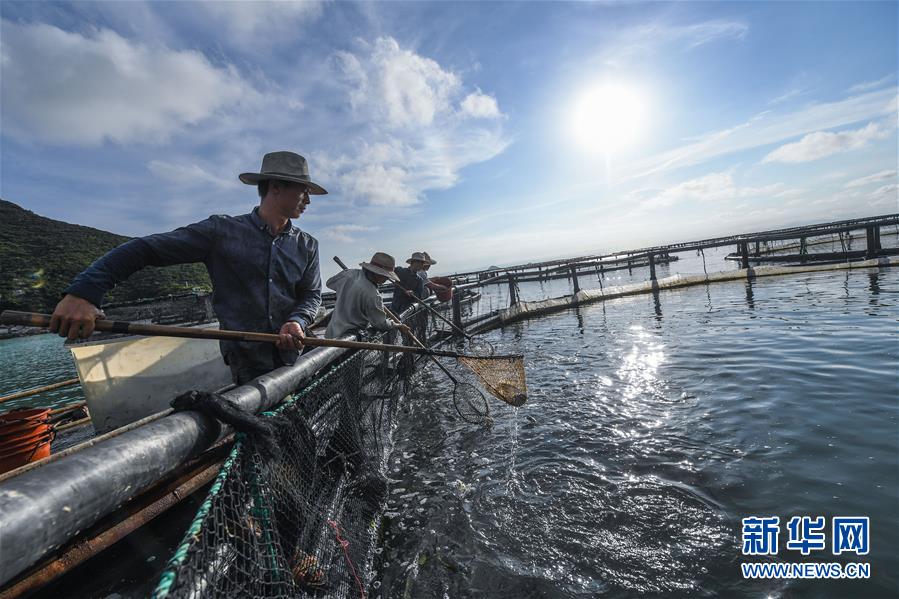 8月18日,南麂岛海域的“海上牧场”养殖区内,渔民正捕捞大黄鱼,处于仿生养殖环境的大黄鱼需要生长2至3年。 进入8月,浙江省温州市平阳县南麂镇海域上大片的大黄鱼、贻贝等特色海产品养殖区域迎来丰收季节,养殖户们驾驶渔船在养殖区海域进行打捞收获,在碧海蓝天下构成了一幅“海上牧场”的美丽丰收景象。 近年来,南麂镇政府引导渔民养殖户充分发挥“靠海吃海”的资源优势,大力发展海洋养殖经济和海岛旅游经济,实现了南麂由“生态美”向“产业美”,“产业美”向“经济美”的转变。同时该镇坚持以大黄鱼、贻贝等为特色产业支撑,精准发展高效海洋养殖业,重点培养一批新型职业渔民,依靠专业技术支持,实现深海仿生养殖,让好生态造就好品质,重点打造南麂养殖品牌,组建营销网络,拓展特色海产品市场。 新华社记者 徐昱摄