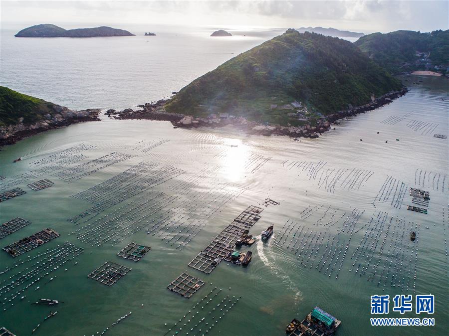 8月19日,空中俯瞰南麂岛海域内的“海上牧场”养殖区(无人机拍摄)。南麂岛位于浙江东南海域,水质好,水温、盐度都适合大黄鱼等养殖鱼类的生长繁殖,因此当地的水产品也一直保持了较高的品质和口碑。 进入8月,浙江省温州市平阳县南麂镇海域上大片的大黄鱼、贻贝等特色海产品养殖区域迎来丰收季节,养殖户们驾驶渔船在养殖区海域进行打捞收获,在碧海蓝天下构成了一幅“海上牧场”的美丽丰收景象。 近年来,南麂镇政府引导渔民养殖户充分发挥“靠海吃海”的资源优势,大力发展海洋养殖经济和海岛旅游经济,实现了南麂由“生态美”向“产业美”,“产业美”向“经济美”的转变。同时该镇坚持以大黄鱼、贻贝等为特色产业支撑,精准发展高效海洋养殖业,重点培养一批新型职业渔民,依靠专业技术支持,实现深海仿生养殖,让好生态造就好品质,重点打造南麂养殖品牌,组建营销网络,拓展特色海产品市场。 新华社记者 徐昱摄