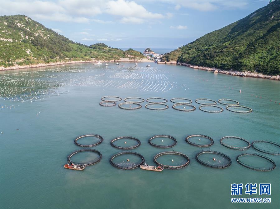 8月18日,渔船在南麂岛马祖岙海域的“海上牧场”大黄鱼养殖区内喂食(无人机拍摄)。南麂岛位于浙江东南海域,水质好,水温、盐度都适合大黄鱼等养殖鱼类的生长繁殖,因此当地的水产品也一直保持了较高的品质和口碑。 进入8月,浙江省温州市平阳县南麂镇海域上大片的大黄鱼、贻贝等特色海产品养殖区域迎来丰收季节,养殖户们驾驶渔船在养殖区海域进行打捞收获,在碧海蓝天下构成了一幅“海上牧场”的美丽丰收景象。 近年来,南麂镇政府引导渔民养殖户充分发挥“靠海吃海”的资源优势,大力发展海洋养殖经济和海岛旅游经济,实现了南麂由“生态美”向“产业美”,“产业美”向“经济美”的转变。同时该镇坚持以大黄鱼、贻贝等为特色产业支撑,精准发展高效海洋养殖业,重点培养一批新型职业渔民,依靠专业技术支持,实现深海仿生养殖,让好生态造就好品质,重点打造南麂养殖品牌,组建营销网络,拓展特色海产品市场。 新华社记者 徐昱摄