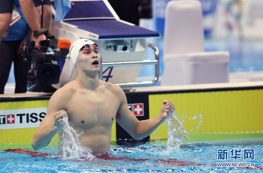 8月19日,中国选手孙杨在赛后庆祝。当日,在第18届亚运会男子200米自由泳决赛中,中国选手孙杨以1分45秒43的成绩夺冠。新华社记者丁汀摄