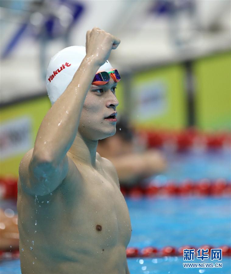 8月19日,中国选手孙杨在赛后庆祝。当日,在第18届亚运会男子200米自由泳决赛中,中国选手孙杨以1分45秒43的成绩夺冠。新华社记者费茂华摄
