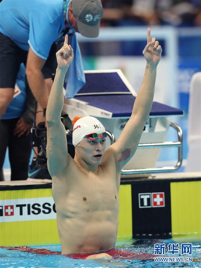 8月19日,中国选手孙杨在赛后庆祝。当日,在第18届亚运会男子200米自由泳决赛中,中国选手孙杨以1分45秒43的成绩夺冠。新华社记者丁汀摄