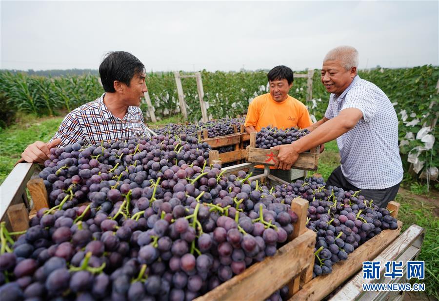 8月19日,唐山海港经济开发区北聂庄村党员刘善权(左一)、常帮新(右一)在帮助果农搬运采摘的葡萄。 近年来,河北省唐山海港经济开发区坚持以农村基层党建引领乡村发展,推行“基层党支部+合作社+农户”的发展模式,以特色产业为抓手,为乡村振兴注入活力。 新华社记者 牟宇 摄