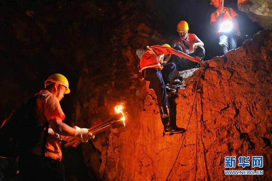 8月20日,护路职工在银洞坡隧道的施工隧道内爬上一处石壁。 新华社记者 刘续 摄
