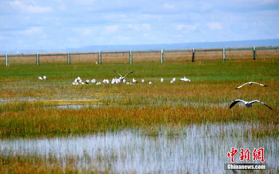 8月18日,青海湖北岸的海北藏族自治州刚察县仙女湾湿地筑巢的红嘴鸥。19日,记者从海北州委宣传部了解到,每年在青海湖迁徙停留的候鸟有92种、超过20万只,是中国境内候鸟繁殖数量最多、种群最为集中的繁殖地。 中新社记者 李隽 摄