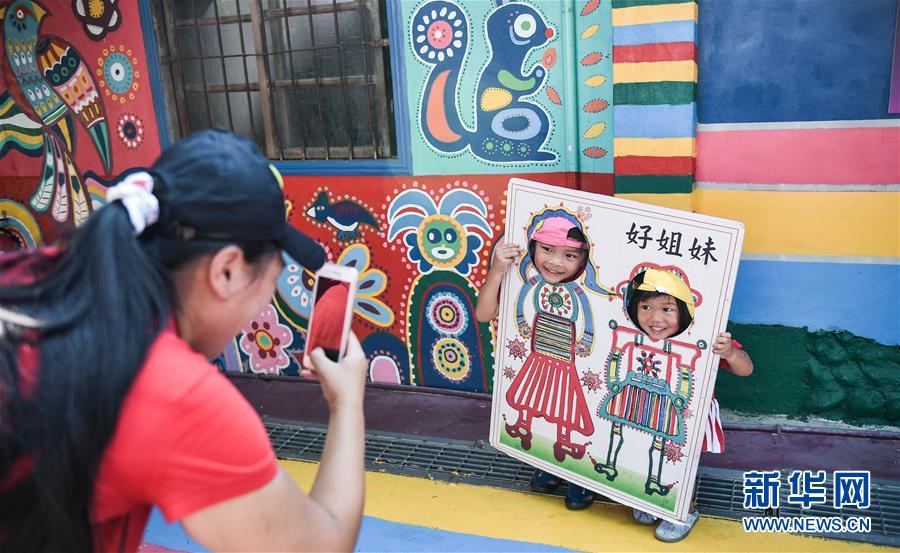 “彩虹眷村”位于台湾台中市南屯区,村内街巷的地面、墙壁、门窗被涂满色彩鲜艳、童趣盎然的绘画,吸引游客前来游览拍照。 新华社记者 薛玉斌 摄
