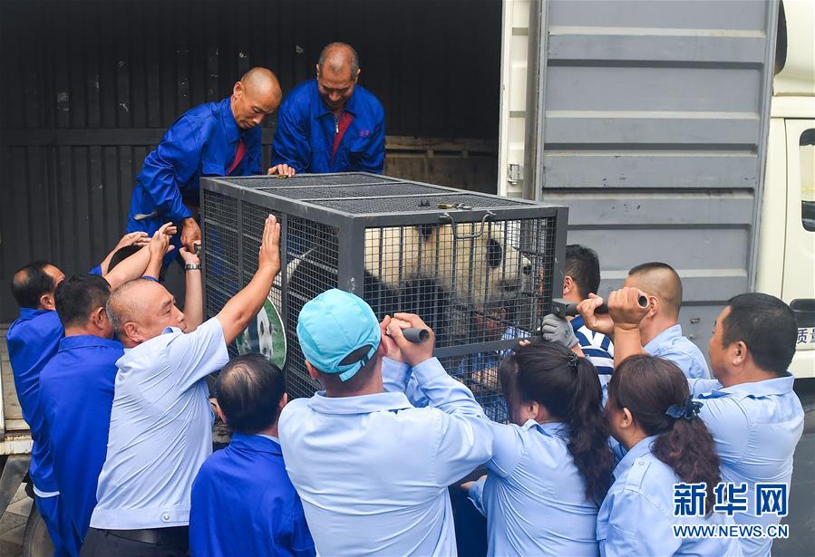 8月20日,工作人员将大熊猫抬上前往机场的运输车。 新华社记者 许畅 摄