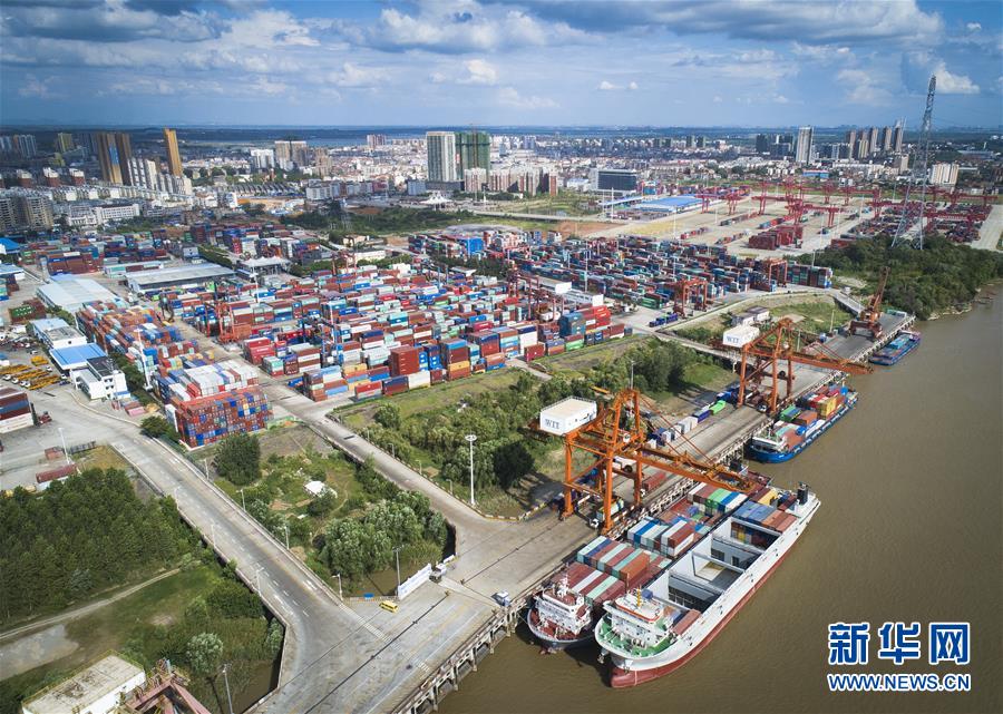 这是武汉长江中游航运中心核心港阳逻港(8月13日无人机拍摄)。新华社记者肖艺九摄