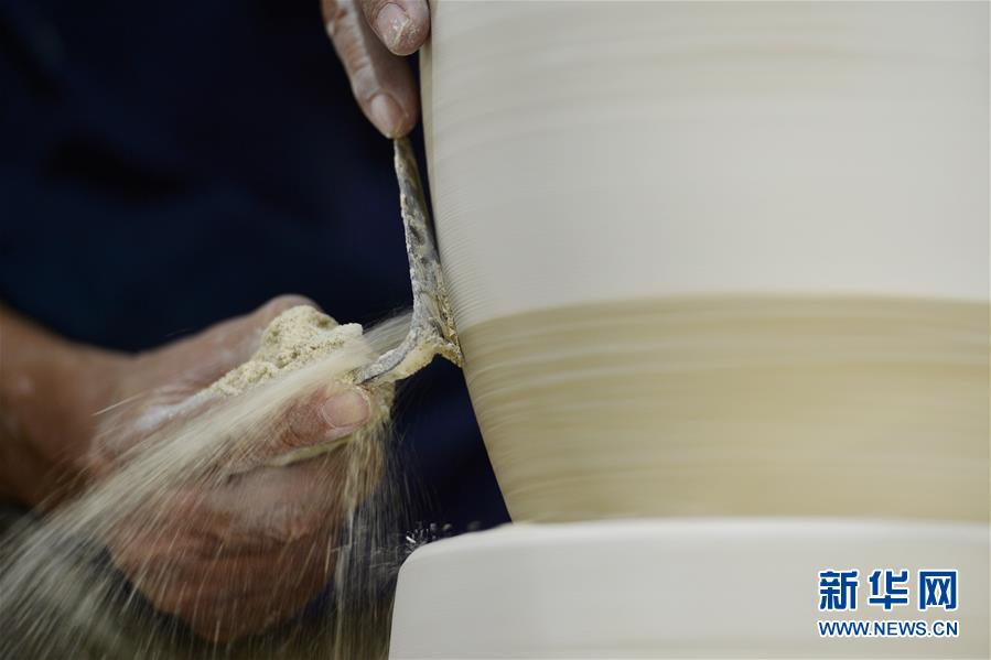 8月21日,在河北省临城县邢窑文化博览园,张志忠在进行邢窑陶瓷修坯作业。 新华社发(陈雷 摄)